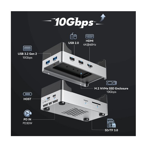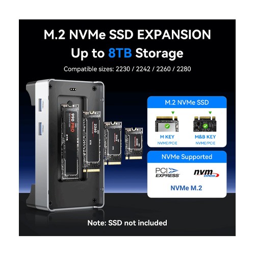The Acasis Mac mini M4 Dock & Stand with integrated 8TB M.2 NVMe SSD enclosure is a premium docking solution that elevates your Mac mini’s performance and connectivity. It transforms your Mac mini into a sleek, high-capacity workstation by stacking the SSD beneath your computer and freeing up valuable desk space. The built-in USB‑C / Thunderbolt ports, HDMI, Ethernet, and multiple USB‑A ports offer full connectivity without compromising on style. With its 8TB high-speed M.2 NVMe SSD, you get lightning‑fast storage access—ideal for video editing, game development, and large file workflows. The aluminum housing acts as a caster-style stand, improving heat dissipation while maintaining a modern aesthetic. This dock is plug‑and‑play, requires no driver installation, and supports Mac, Windows, and Linux systems. Whether you’re building a compact, high-performance home studio or simply want a minimalist desk setup, the Acasis Mac mini M4 Dock & Stand with 8TB SSD provides seamless storage, powerful connectivity, and elegant design.