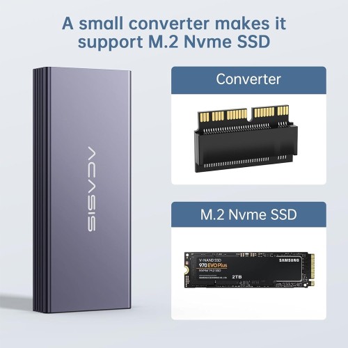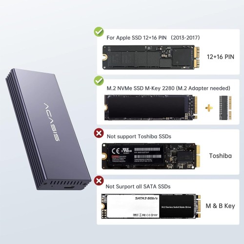 This USB C 3.2 SSD enclosure works well for Apple original Mac SSDs with 12+16 Pins. Support M.2 NVMe SSDs with the included enclosure interface adapter. *NOT support Toshiba 12+16 PIN SSDs or SATA SSDs.