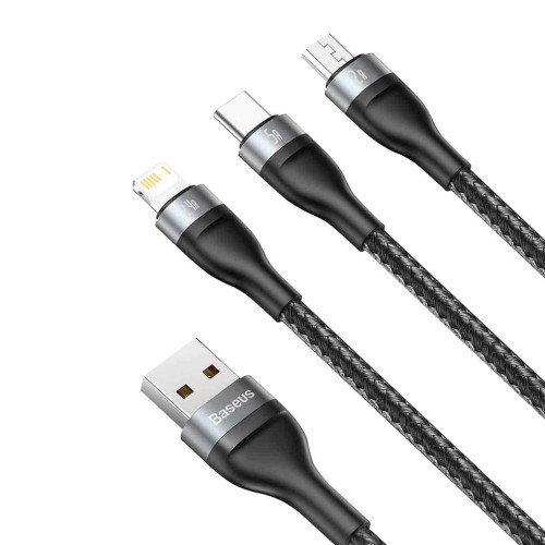 The cable offers the replacement of one data cable by a micro-USB, Lightning, and Type-C cable. This is storage efficient, saving desktop space, and travel friendly, allowing you to charge 3 devices with one cable.