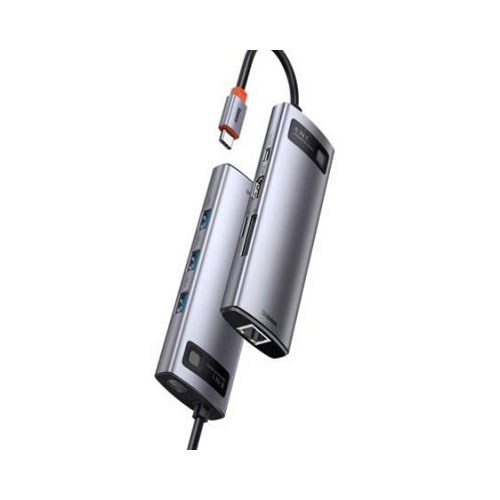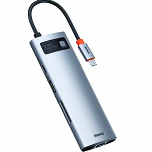 Baseus HUB Metal Gleam Series 8-in-1 Multifunctional Gray (CAHUB-CV0G) offers its users 8 ports, 3 USB plugs, 1 USB Type C, 1 USB Type C Power Delivery, HDMI, 2 slots for memory cards and RJ45 for cable connection to the Internet.