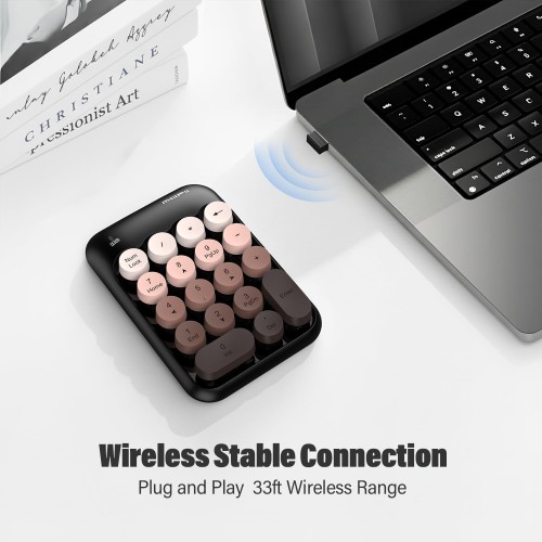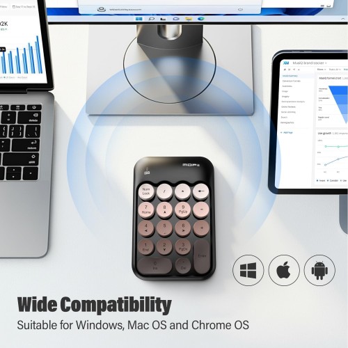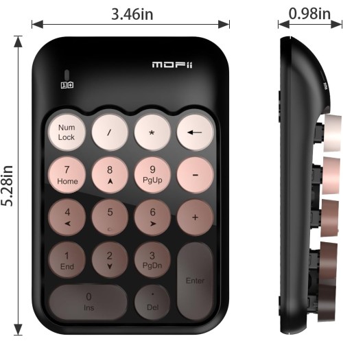 The MOFII Cute Colorful Wireless Number Pad is a compact and stylish 18-key numeric keypad designed to improve productivity for laptop and desktop users. With its cute retro colorful design and round keycaps, it not only enhances typing comfort but also adds an aesthetic touch to your workspace. It connects via stable 2.4GHz wireless technology, ensuring smooth and lag-free performance for everyday office and personal use. This wireless number pad is ideal for accounting, data entry, Excel work, and financial tasks where fast numeric input is essential. The plug-and-play USB receiver allows instant connection without any driver installation. Its lightweight and portable design makes it easy to carry, making it a perfect companion for students, professionals, and remote workers. Built for convenience and efficiency, the MOFII numeric keypad offers soft, quiet keystrokes for comfortable long-term use. It is compatible with Windows, macOS, and most laptops and desktops that support USB connectivity. The energy-efficient wireless system ensures stable performance while reducing power consumption, making it a reliable productivity tool for daily tasks.