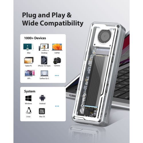 The ORICO AAGM2 Transparent USB 4 NVMe SSD Enclosure delivers incredible speeds, allowing users to transfer large files in seconds. Supporting a 40Gbps transmission rate and leveraging USB 4 and Thunderbolt 4 technologies, it enables read/write speeds up to 3500/2500MB/s on compatible systems, offering three times the speed of USB 3.2. Whether you’re a gamer, video editor, or data analyst, this enclosure is built to handle the most demanding data transfer needs.