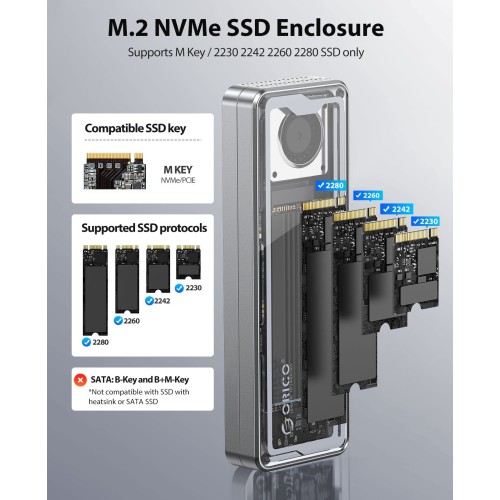 The ORICO AAGM2 enclosure features an innovative tool-free design, making SSD installation quick and easy. With a sleek aluminum base and a transparent cover, it combines durability with a stylish aesthetic that complements any setup.