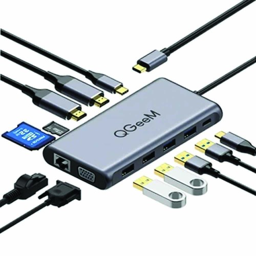 Qgeem QG-UH12-H 12-in-1 Super Expansion USB-C Hub. All Expansion From A Single USB-C Port, You Will Get 2 HDMI Output,1 DP Output, 4K Resolution And Vivid Video,1 Type C PD 3.0 Charging Port Provides 75W Super-Fast Charging Speed,1 USB 3.0 Type C Port, 2 USB 3.0 Ports And 2 USB 2.0 Ports Help You Transfer The Data With 5Gbps Super-Speed And Connect With The Wireless Devices; 1000M RJ45 Ethernet Port And SD & TF 5Gbps Card Reader Makes You Get Way More.