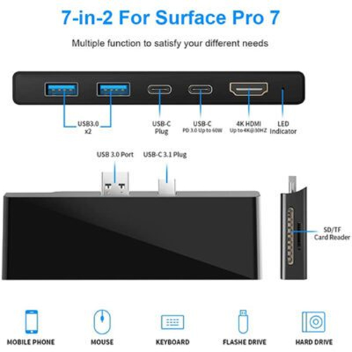 Rocketek Surface Pro 7 USB-C dock is specifically designed for Surface Pro 7, expands USB and Mini Displayport into a 4K @ 30Hz HDMI port, multi-port USB hub with 3 USB 3.0 ports, SD card reader And TF (micro SD) card reader.