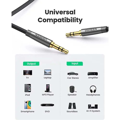 Features wear-resistant and tangle-free nylon braid jacket to make it easy to roll up for tidy storage. Reinforced brass shells protect the cord against bending, cracking when rolled up. UGREEN 3.5mm Audio Cable is ready to go and fills you with music wherever you are, whenever you like. The slim connector with step-down design ensures a snug fit to devices of standard auxiliary ports, like car stereo radio, TV, headphones, earphones, speakers, amplifiers, soundbox, soundbar, laptops, tablets, smartphones, and more.