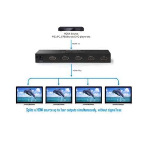 UGREEN 40202 1×4 HDMI Amplifier Splitter is a device that allows users to connect any digital video source, such as: DVD, Satellite, Cable Box, PC, Xbox, PS3 and more with up to 4 digital HDMI displays. It Splits an HDMI source up to four outputs simultaneously, without signal loss where input port: 1x HDMI female port (Type A connector), Output Ports: 4 x HDMI female ports.