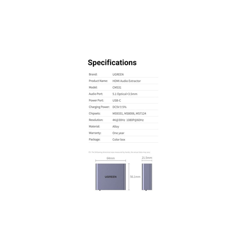 The UGREEN 60649 HDMI Audio Extractor (SPDIF+3.5mm AUX) is a compact yet powerful device designed to solve audio connectivity challenges, ensuring seamless and versatile audio output options from HDMI sources.This extractor stands as a bridge between HDMI-enabled devices and audio systems, offering an effective solution for splitting HDMI audio signals to multiple output sources. With support for both SPDIF optical and 3.5mm auxiliary audio output, it provides flexibility to connect to various audio setups, including speakers, soundbars, headphones, or amplifiers, catering to diverse preferences or setups.The extractor excels in preserving audio quality. It supports high-quality audio formats, ensuring that the extracted sound maintains its original fidelity and clarity. Whether you're streaming movies, gaming, or enjoying music, it delivers an immersive audio experience by preserving the integrity of the audio signal.Featuring a simple and user-friendly design, the UGREEN 60649 HDMI Audio Extractor operates hassle-free without requiring additional power adapters or complex installations. Its plug-and-play functionality allows for effortless setup and immediate use, providing convenience for users without technical expertise.Moreover, its compact size and durable build make it a portable and reliable accessory for various settings. Whether you're at home, in the office, or on the move, this extractor offers a stable and dependable solution for audio extraction needs.This device caters to a broad spectrum of users, including home entertainment enthusiasts, gamers, professionals in AV setups, and anyone seeking a reliable method to extract audio from HDMI sources. Its versatility, audio quality preservation, ease of use, and compatibility with various audio systems make it an essential addition to any audio setup, offering an enhanced and customizable audio experience for users across different scenarios.