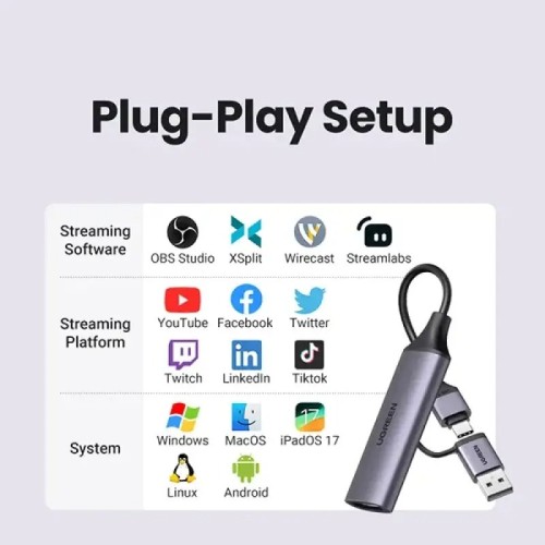 The UGREEN CM716 (25854) HD USB Video Capture Card is built for modern streamers and content creators who demand high performance, stable transmission, and professional-grade video quality. Below are the full specifications and advanced features that make this capture card a powerful streaming solution: