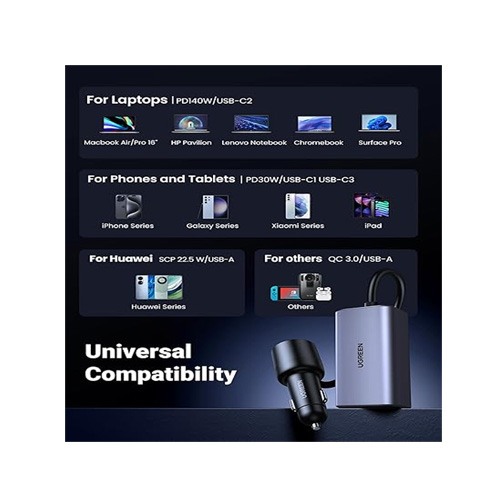 The UGREEN NEXODE GAN 150W car charger stands out for its exceptional performance, offering rapid and safe charging capabilities for multiple devices simultaneously. This car charger is equipped with 4 charging ports, including USB-C ports, allowing you to charge your MacBook, iPhone, Samsung Galaxy, and other compatible devices with ease. Thanks to GaN technology, the charger generates less heat, ensuring efficient performance, and its compact design fits perfectly in any vehicle. If you're looking for a fast charging car adapter that supports dual-port car charging and provides high-speed charging, this product is a perfect fit for you.