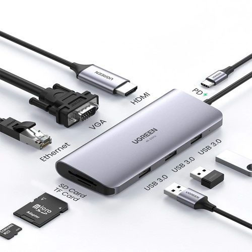 Meet your job needs: UGREEN USB C Hub includes 3 USB3.0 ports, 1 USB C PD Charging Port, 1 HDMI video output, 1 VGA male-to-female port Audio/Mic 2-in-1 port,1 RJ 45 Gigabit Ethernet port, 1 SD/Micro SD card slot, 1 TF card slot. Multi-functional integration to meet all your work needs.
